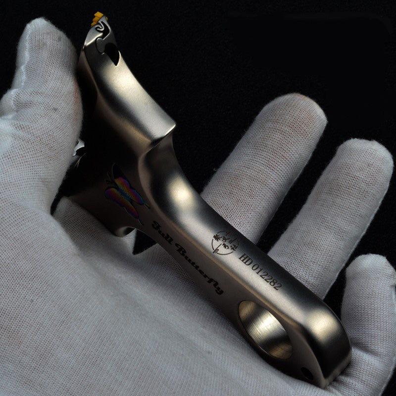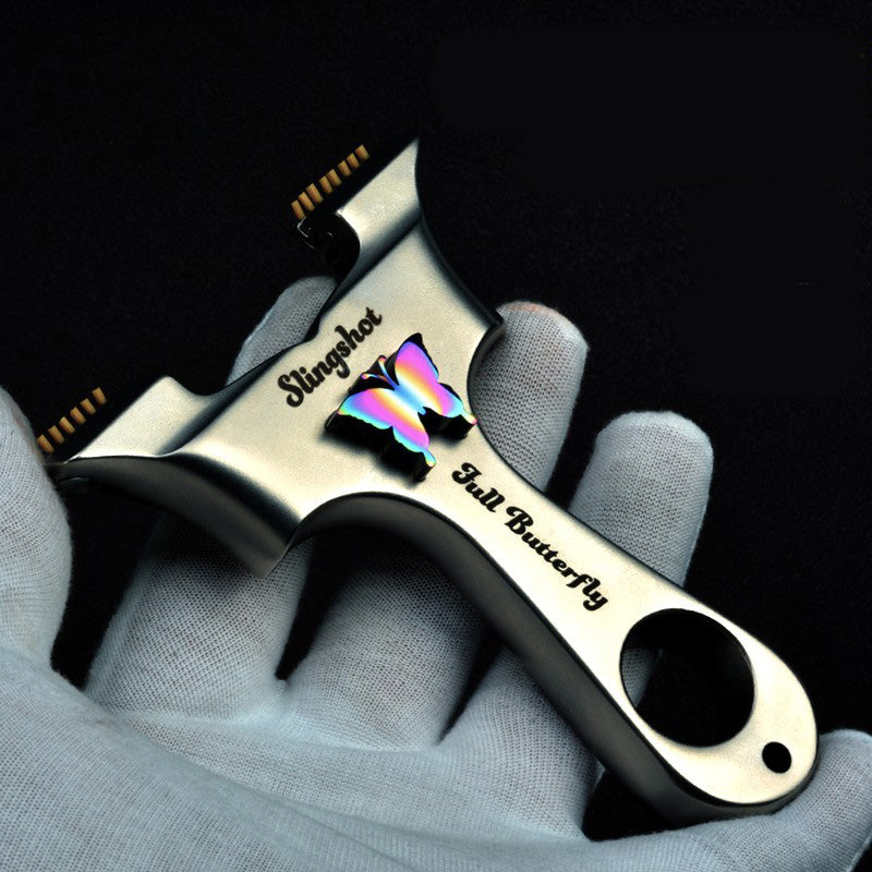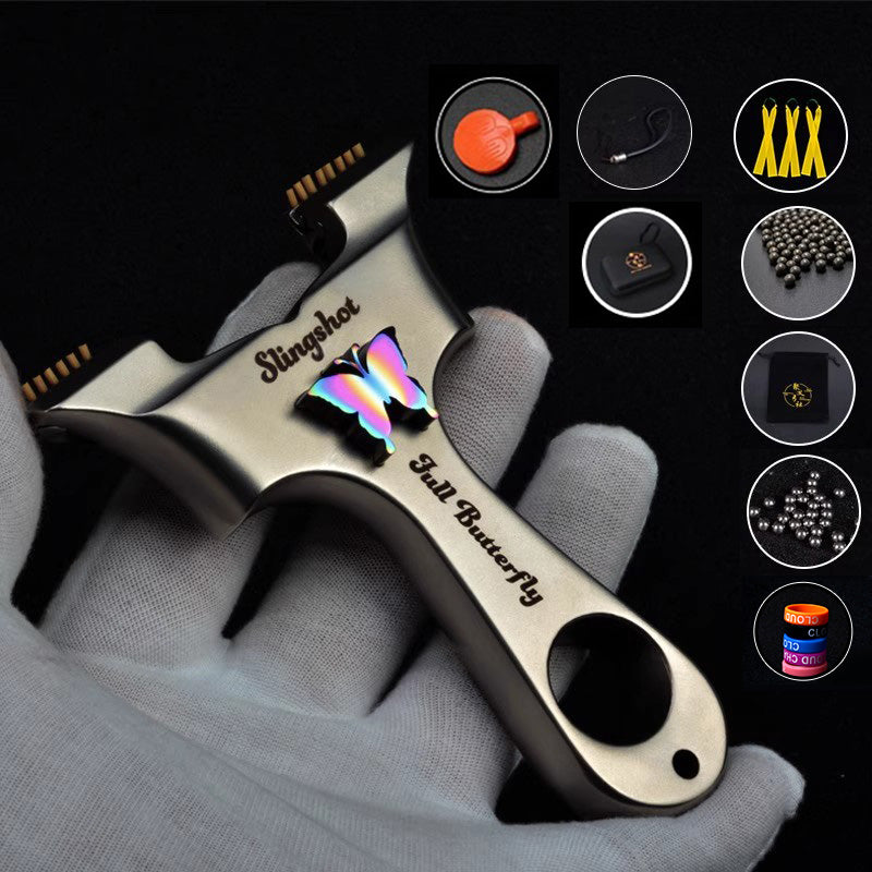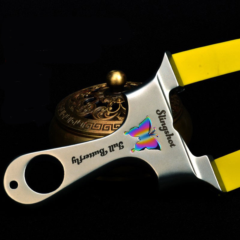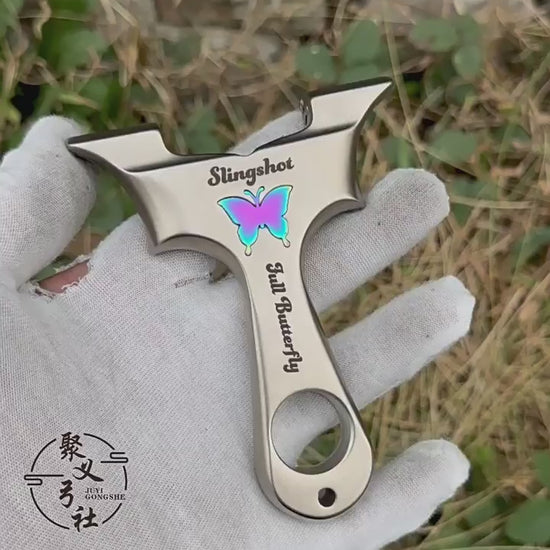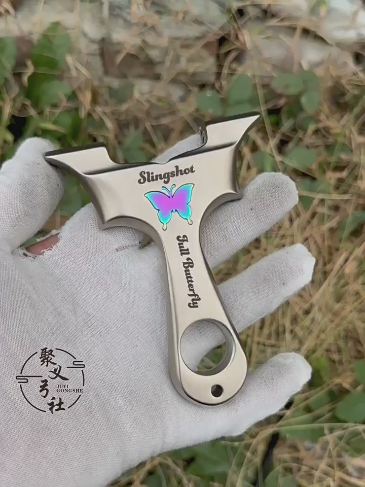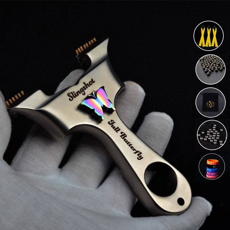 スリングショット ビー玉銃 蝶の模様 ステンレス製スリングショット 龍の歯型ゴム固定クリップ 動物駆除器 害獣・害虫防除器 流線型 屋外 ターゲットゲーム 狩猟 屋外玩具セット クマ駆除ツール クマ防除用品