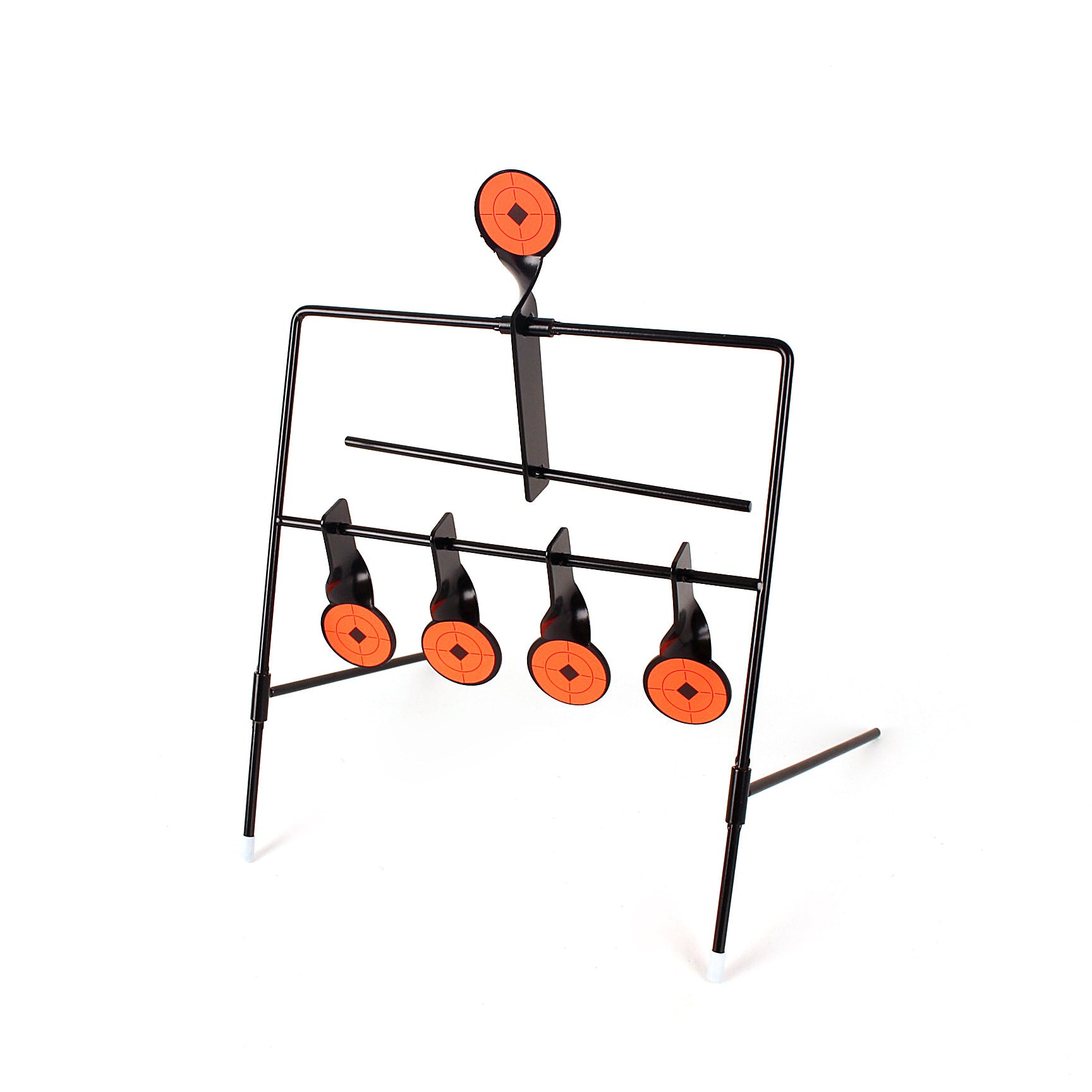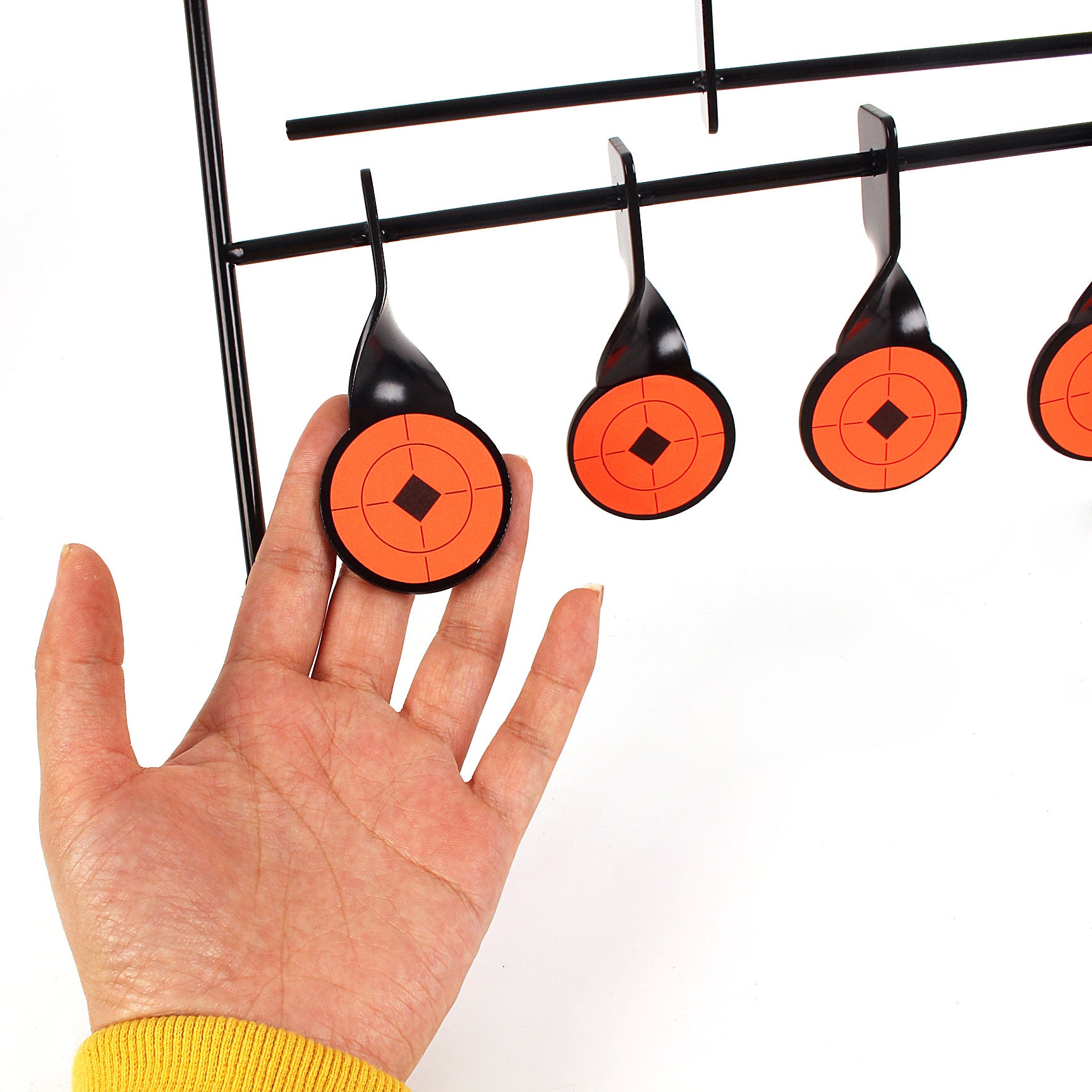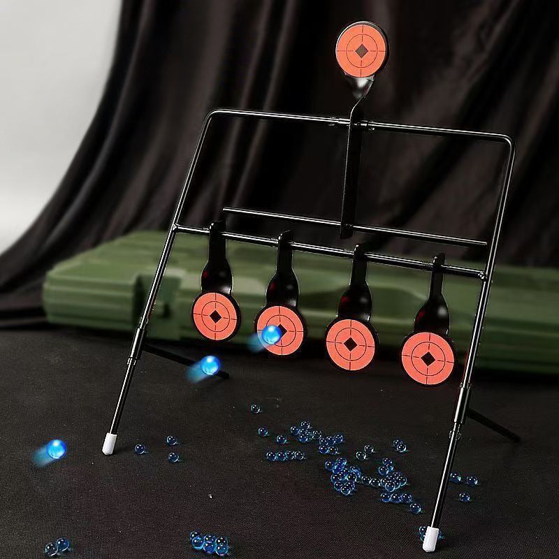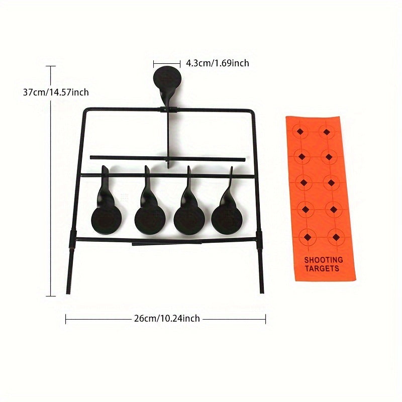 製品:自動起立ターゲット特徴:5つの的を装備し、多角的な練習が可能。手動操作不要で、命中後自動的に的がリセットされるため非常に便利材質:ステンレス鋼サイズ:的枠幅:26cm、高さ:37cm。的直径:4.3cm