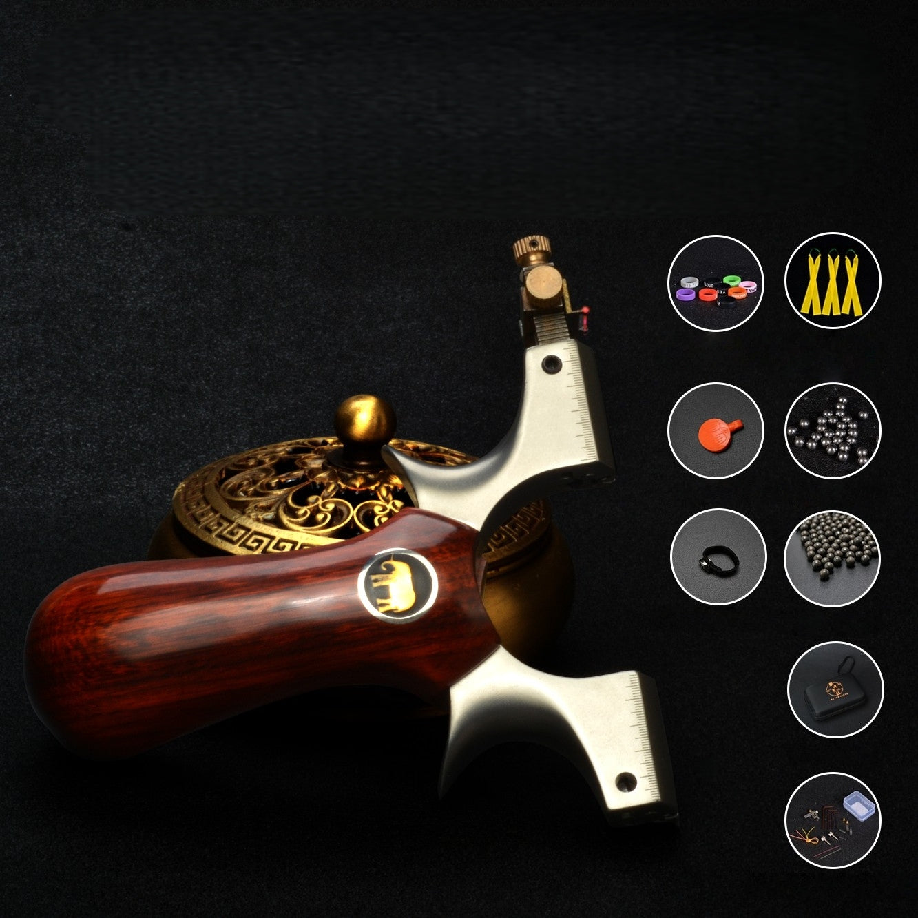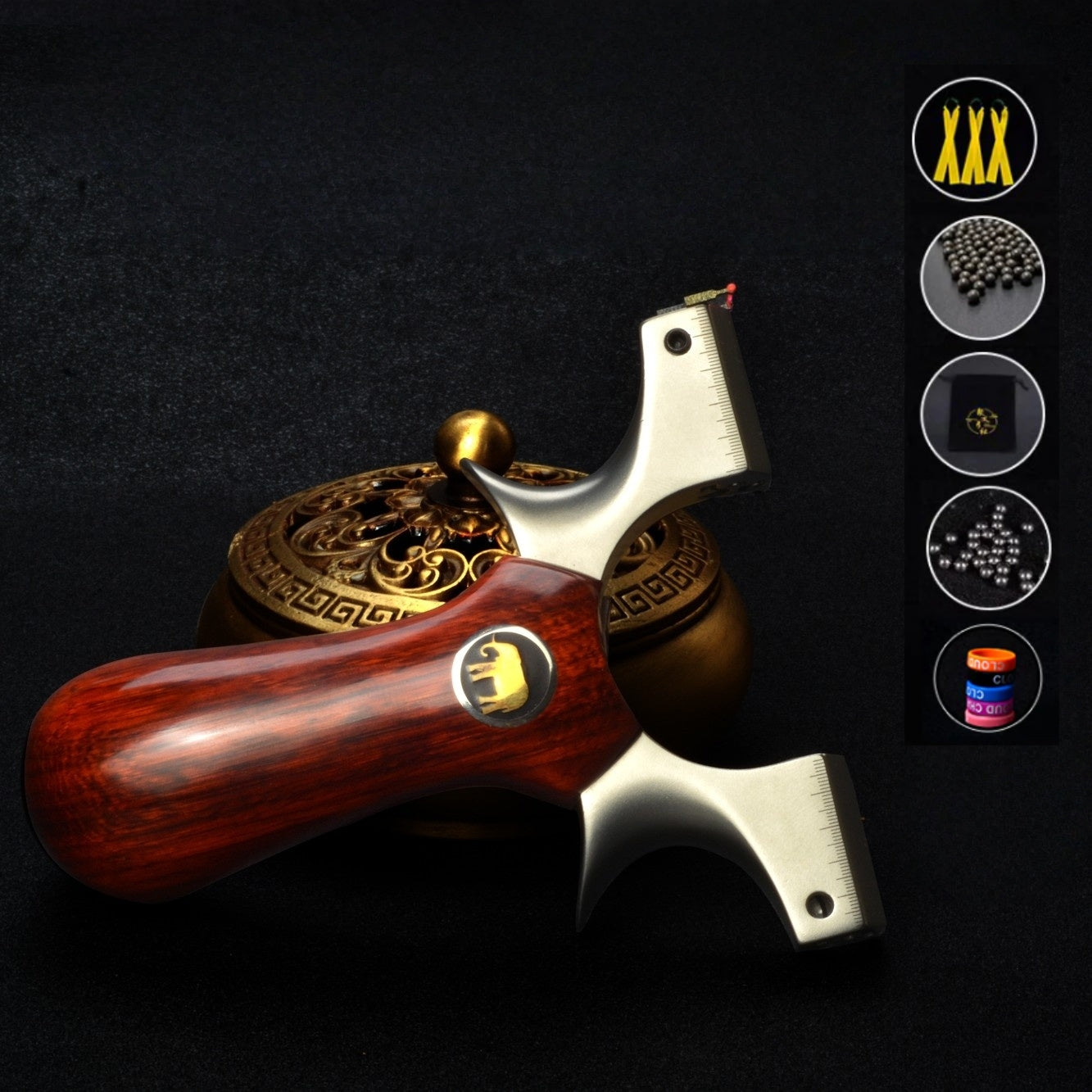 2. 究極版:本体、高品質ゴムバンド10本、スリングショット収納ボックス1個、スリングショット収納袋1個、滑り止めゴムリング10個、シリコンターゲット2個、高精度照準器セット1組、専用レンチ工具セット、マグネットリング1個、鋼球(8mm)400粒、粘土弾(8mm)600粒